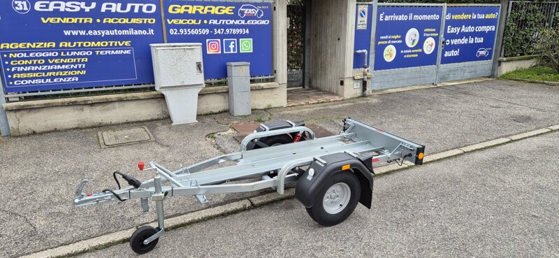 Rimorchio a singola corsia adatto al trasporto di una moto versione plus senza freni ed equipaggiato con ruotino di appoggio anteriore e ammortizzatori idraulici anti saltellamento. Le immagini sono solo a scopo illustrativo e potrebbero mostrare accessori opzionali.