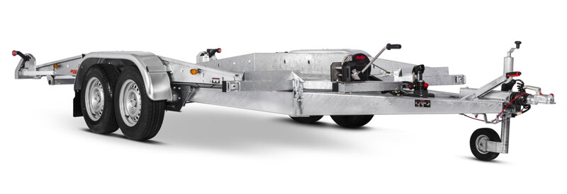 Rimorchio trasporto auto con ruote esterne e basso Angolo di carico , versione doppio asse. Dettagli intelligenti e costruzione durevole rendono questo rimorchio la prima scelta per esempio per meccanici e piloti. L'inclinazione idraulica, l'argano e le rampe sono di serie. Le immagini sono solo a scopo illustrativo e potrebbero mostrare attrezzature opzionali